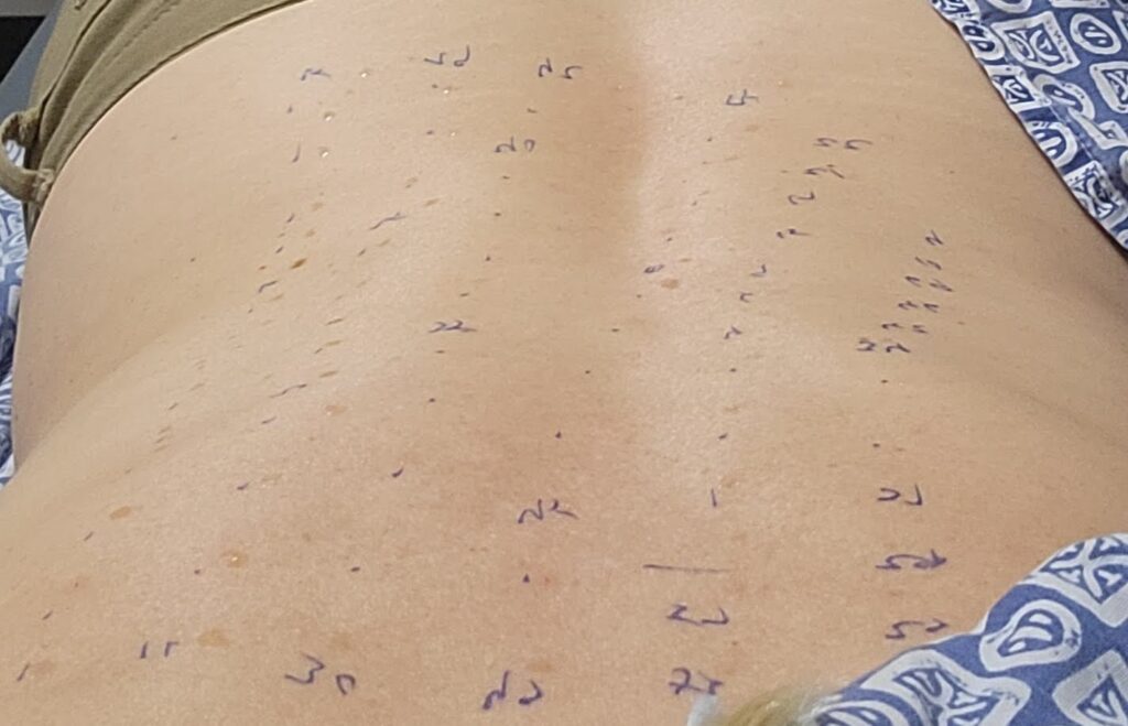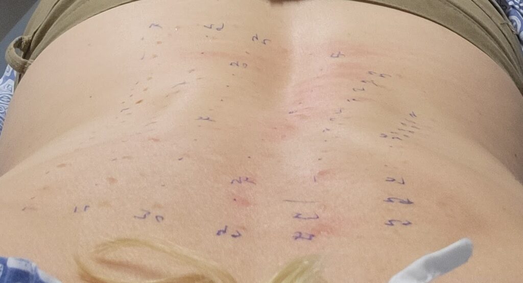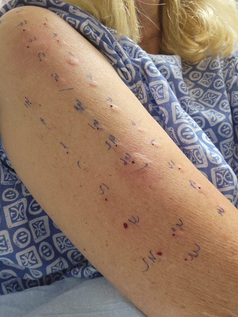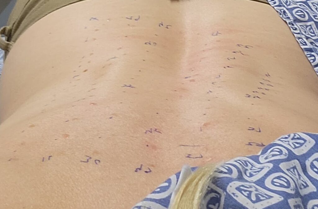 I’ve had skin patch testing twice—40 tiny injections across my arms and 50+ on my back. I was told they might cause small hives, but I reacted so strongly they merged into one massive hive, and I was still itching up to a week later. The results? Highly allergic to 39 of the 40 environmental substances tested on my arms, and reactions to about half of what they tested on my back.
